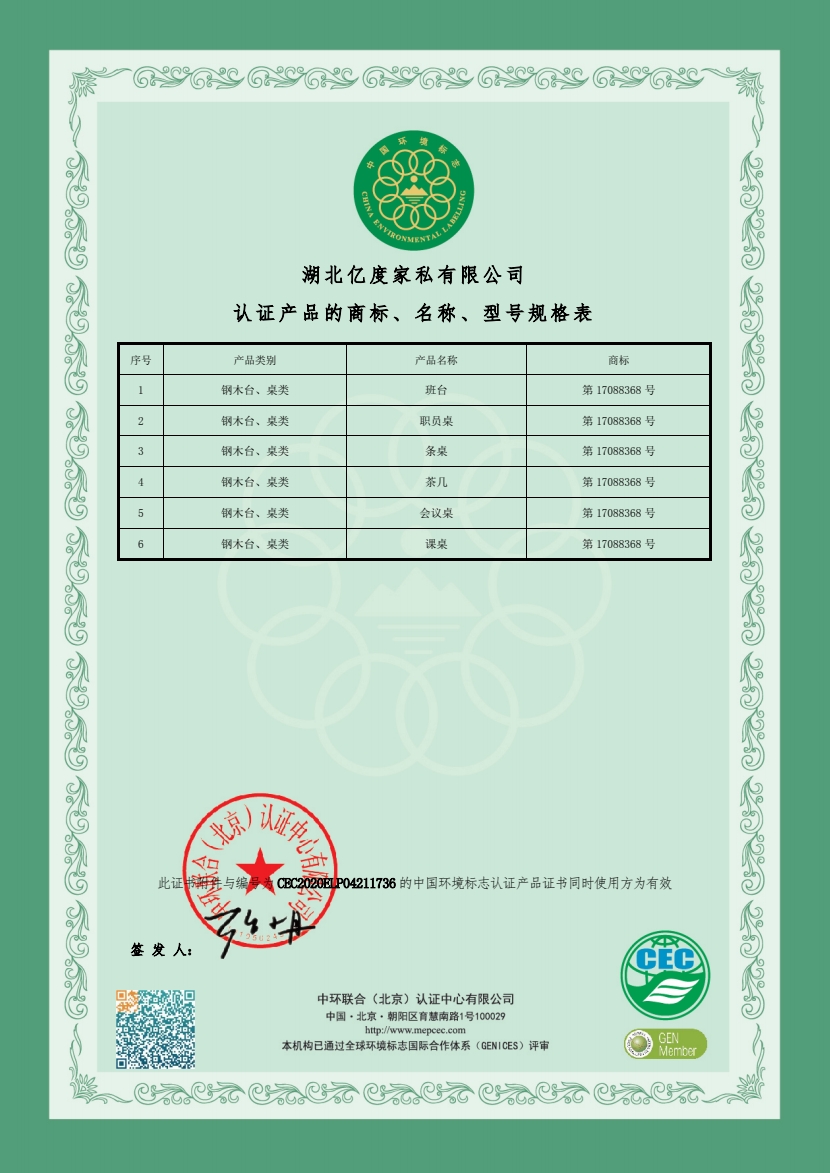 钢木桌类环保证书